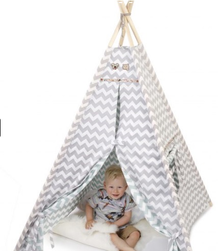 Naaipatroon tipi (of indianentent), inclusief werkbeschrijving.U kunt de tent zowel van dikke canvasstof maken als van katoen. De katoenen versie zoals op de foto hiernaast, is van dubbele stof gemaakt. Op deze manier kunt u voor de binnenkant (voeringstof) een andere kleur kiezen dan voor de buitenkant.