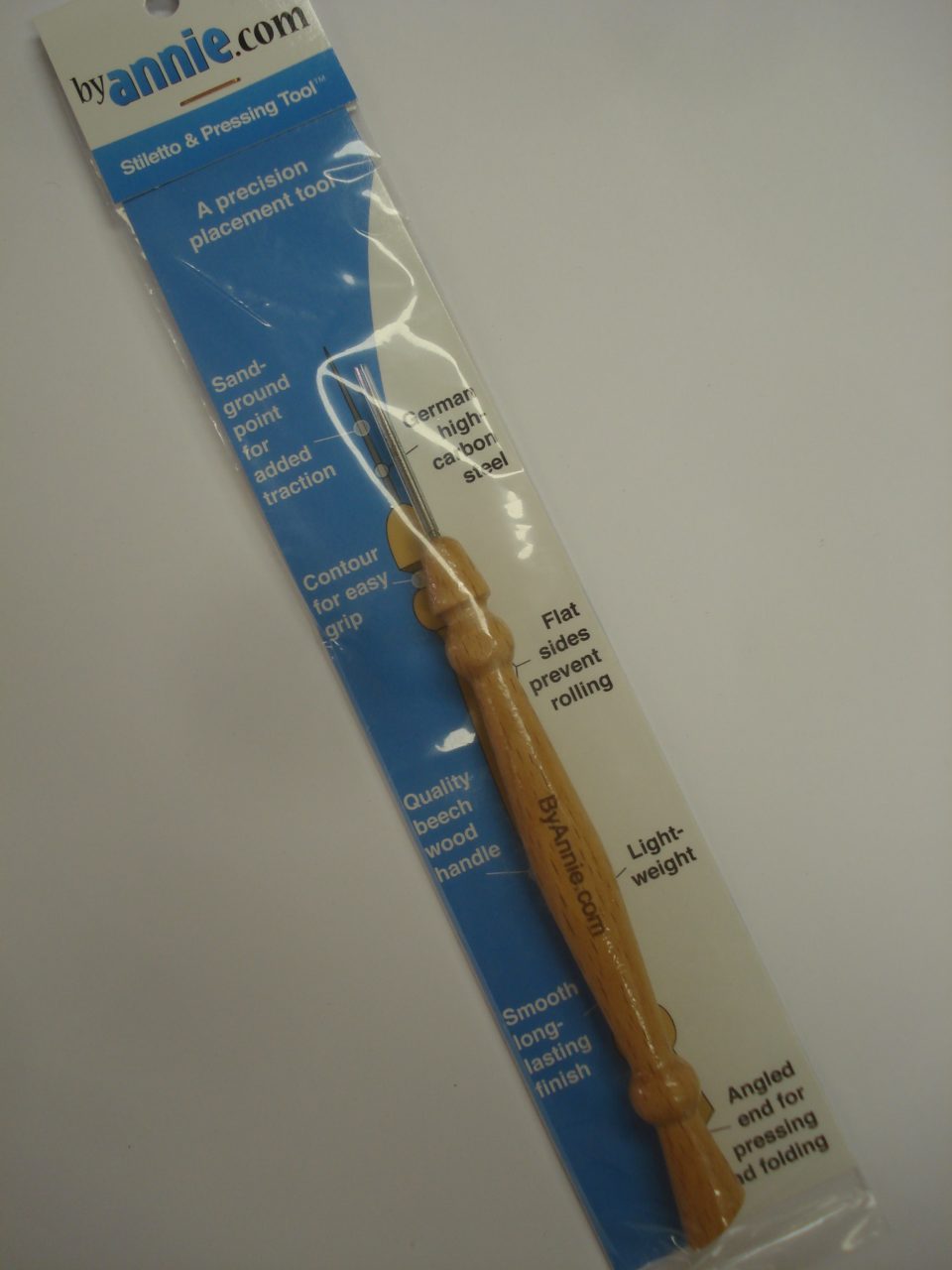 Stiletto van By Annie is een prachtig gevormde priem die het maken van o.a. tassen vergemakkelijkt. Soms kom je een vinger of handje te kort om iets onder je voetje van je naaimachine te sturen dan is dit een handige oplossing. Hij ligt super in de hand en is licht van gewicht, maar wel heel sterk. De punt is van Carbon. En met de achterkant kan je prima naden glad strijken.